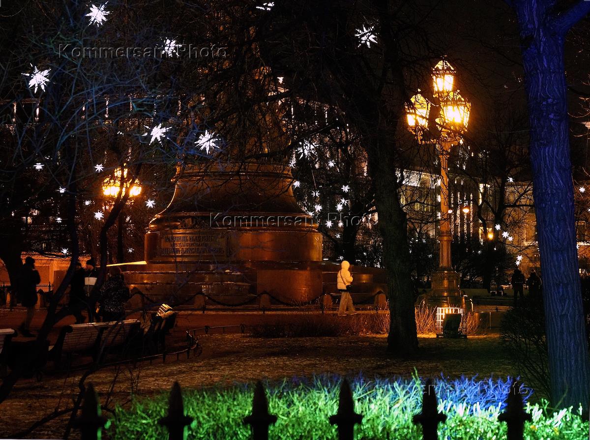 Виды Санкт-Петербурга. Жанровая фотография. Вечернее предновогоднее освещение в виде рождественских звезд у памятника императрице Екатерине Великой.