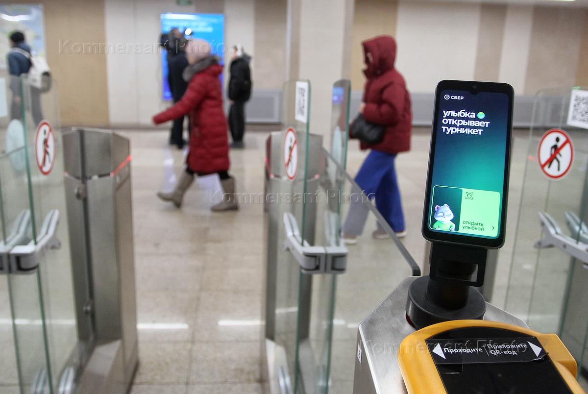 Презентация системы биометрической идентификации пассажиров на станции метро "Стрелка". Пассажиры идут мимо надписи на тачскрине: "Улыбка открывает турникет".
