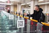 Презентация системы биометрической идентификации пассажиров на станции метро "Стрелка". Ряд цифровых турникетов с QR-кодами.