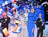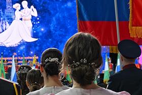 IX Международный кремлевский благотворительный кадетский бал (МБКБ) в Гостином дворе. Руководитель Патриотического проекта "Международный Благотворительный Кадетский Бал" (МБКБ), председатель Оргкомитета МБКБ, президент Благотворительного фонда Юлии Кирпичниковой по поддержке социально-экономических программ Юлия Кирпичникова (слева) и курсант Пермского президентского кадетского училища имени Героя России Кузьмина войск национальной гвардии Диана Ягопасова, получившая звание "Принцесса бала", во время церемонии награждения.
