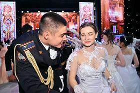 IX Международный кремлевский благотворительный кадетский бал (МБКБ) в Гостином дворе. Курсант Пермского президентского кадетского училища имени Героя России Кузьмина войск национальной гвардии Диана Ягопасова (слева), получившая звание "Принцесса бала", и помощник директора Федеральной службы войск национальной гвардии России (Росгвардия) Алексей Воробьев (справа) во время церемонии награждения.