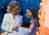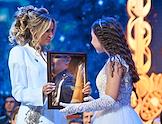 IX Международный кремлевский благотворительный кадетский бал (МБКБ) в Гостином дворе. Руководитель Патриотического проекта "Международный Благотворительный Кадетский Бал" (МБКБ), председатель Оргкомитета МБКБ, президент Благотворительного фонда Юлии Кирпичниковой по поддержке социально-экономических программ Юлия Кирпичникова (слева) и курсант Пермского президентского кадетского училища имени Героя России Кузьмина войск национальной гвардии Диана Ягопасова (справа), получившая звание "Принцесса бала", во время церемонии награждения.