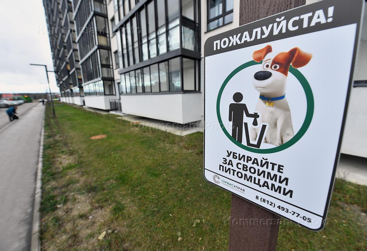 Жилой комплекс (ЖК) "ЛесART" Группы компаний "ЕДИНО" (ЛенРусСтрой). Жанровая фотография. Информационная табличка "Пожалуйста! Убирайте за своими питомцами".
