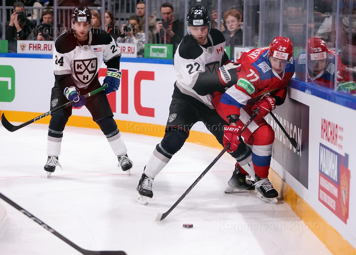 Кубок Первого канала по хоккею. Матч между сборной "Россия 25" и Сборной мира КХЛ на стадионе "СКА Арене". Игрок Сборной мира КХЛ Колби Уильямс (в центре) и игрок команды "Россия 25" Михаил Котляревский (справа) во время матча.