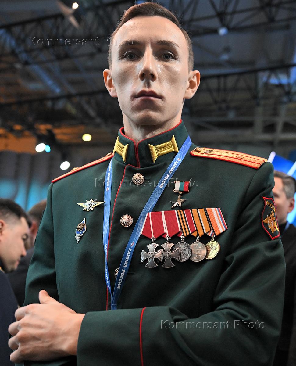 Съезд Всероссийской политической партии "Единая Россия" в национальном центре "Россия". Герой России майор Андрей Митяшин во время съезда.