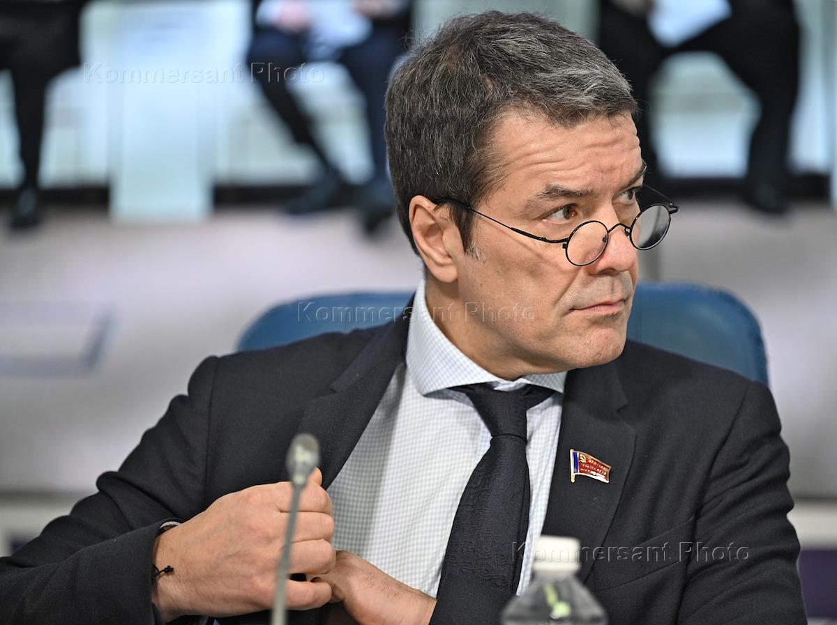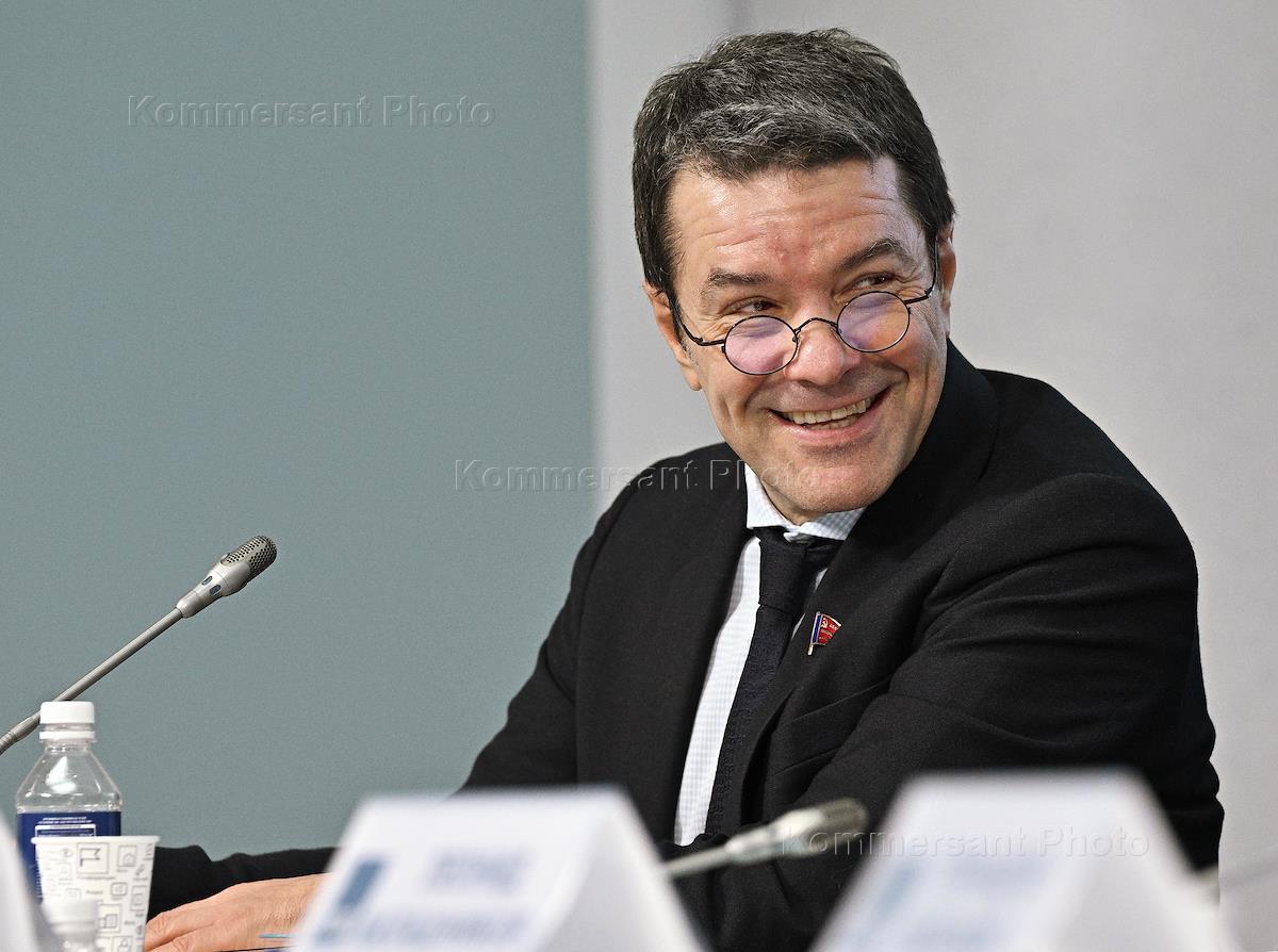 Пресс-конференция руководства КПРФ, посвященная подведению итогов уходящего года и планам партии по празднованию 80-летия Победы в Великой Отечественной войне, в пресс-центре ТАСС. Первый заместитель председателя комитета Государственной думы России по информационной политике, информационным технологиям и связи Александр Ющенко во время пресс-конференции.