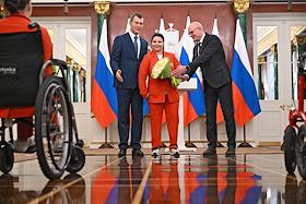 Церемония вручения государственных наград российским победителям и призерам XVII Паралимпийских летних игр в Париже в Большом Кремлевском дворце. Слева направо: министр спорта России Михаил Дегтярев, бронзовый призер в толкании ядра Ирина Вертинская и заместитель председателя правительства России Дмитрий Чернышенко во время церемонии.