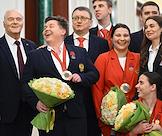 Церемония вручения государственных наград российским победителям и призерам XVII Паралимпийских летних игр в Париже в Большом Кремлевском дворце. Бронзовый призер Паралимпиады-2024 в индивидуальных соревнованиях по настольному теннису в классе WS6 Маляк Алиева (в центре) на церемонии.