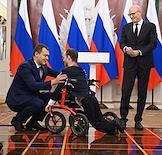 Церемония вручения государственных наград российским победителям и призерам XVII Паралимпийских летних игр в Париже в Большом Кремлевском дворце. Слева направо: министр спорта Михаил Дегтярев, двукратный серебряный призер Паралимпиады-2024 в плавании на спине на дистанциях 50 и 100 метров в классе S2 Владимир Даниленко и заместитель председателя правительства России Дмитрий Чернышенко во время церемонии.