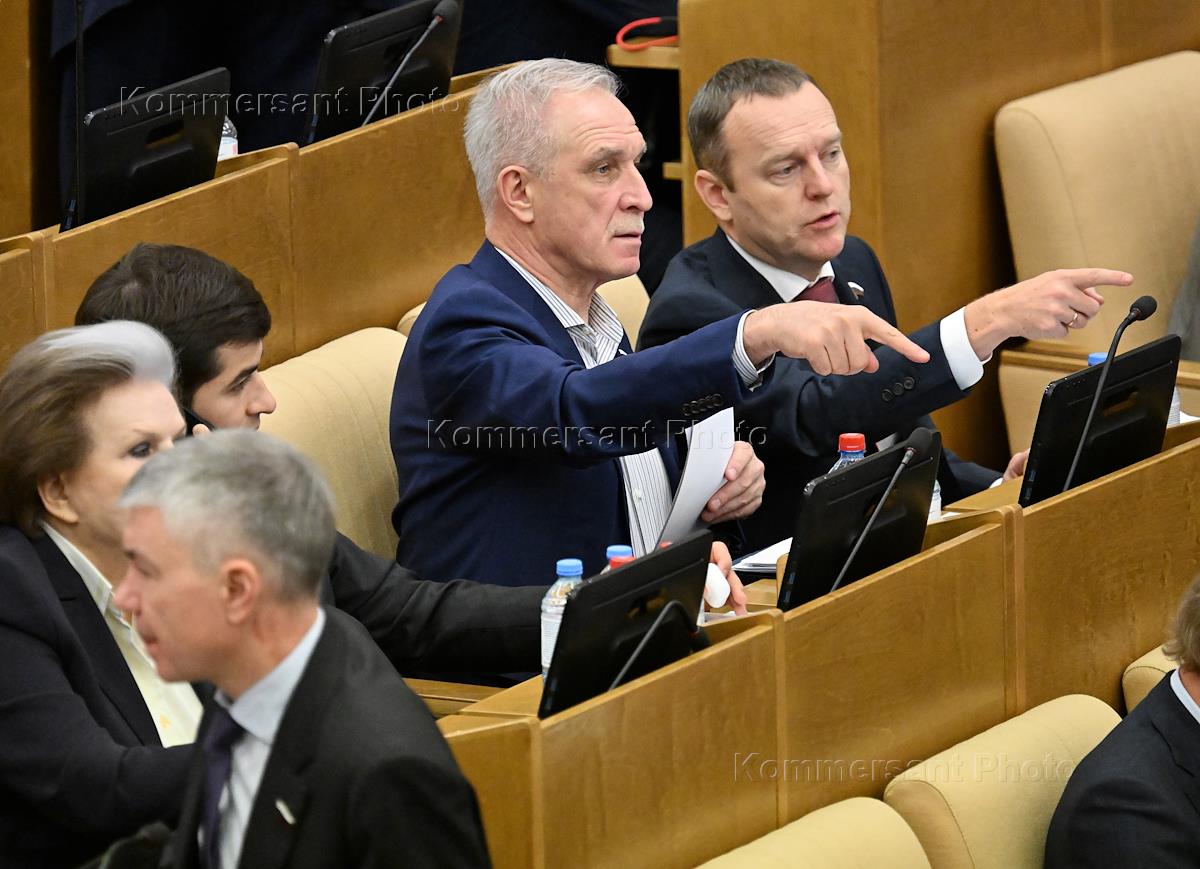 Пленарное заседание Государственной думы (ГД) России. Первый заместитель комитета ГД России по региональной политике и местному самоуправлению Сергей Морозов (в центре) и первый заместитель председателя комитета ГД России по финансовому рынку Константин Бахарев (справа) во время заседания.
