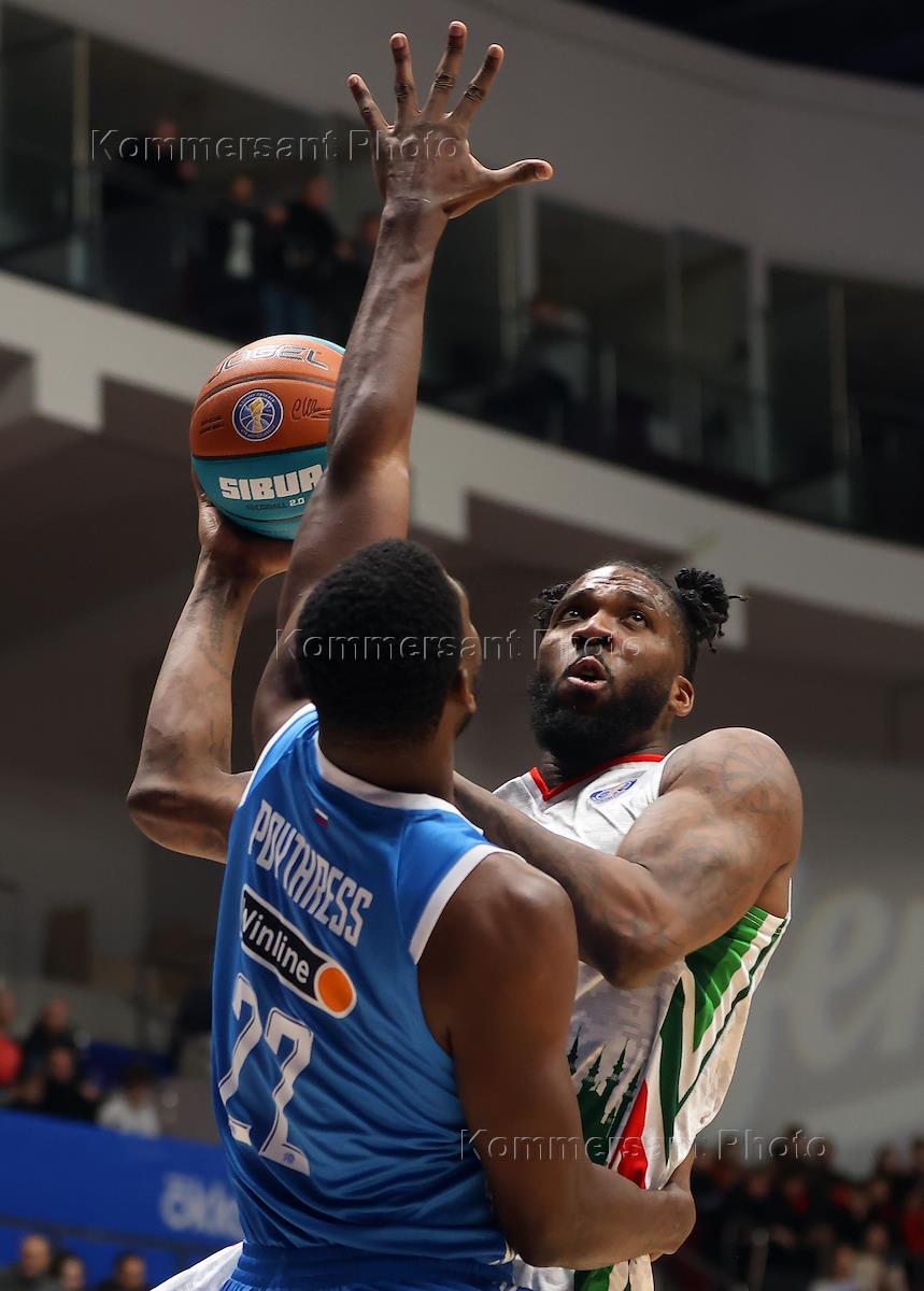 Единая лига ВТБ по баскетболу. Матч между командами "Зенит" (Санкт-Петербург) - УНИКС (Казань) на стадионе "Арена". Игрок команды УНИКС Девон Акун-Пёрселл (слева) и игрок команды "Зенит" Дуэйн Бэйкон (справа) во время матча.