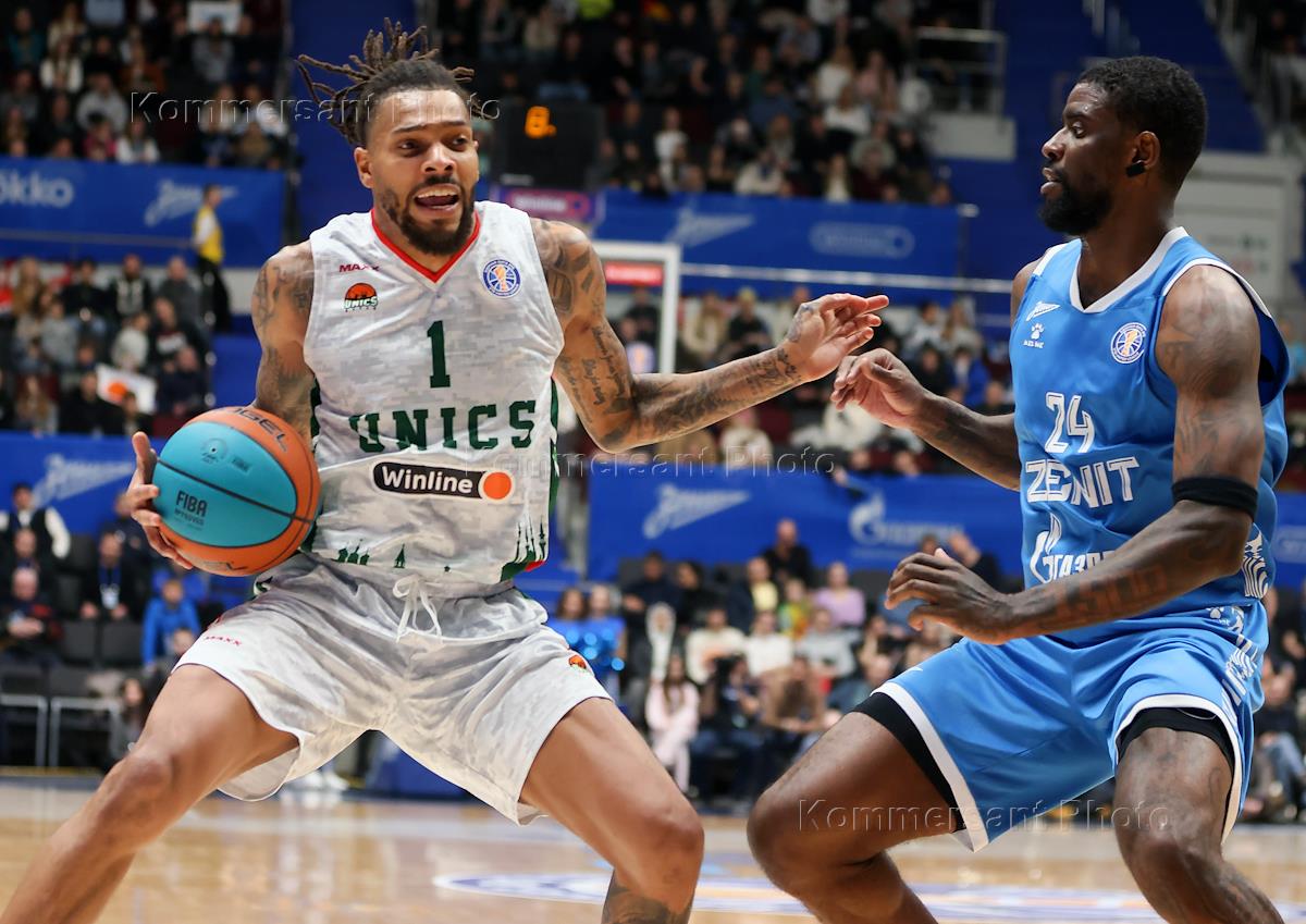 Единая лига ВТБ по баскетболу. Матч между командами "Зенит" (Санкт-Петербург) - УНИКС (Казань) на стадионе "Арена". Игрок команды УНИКС Джален Рейнольдс (в центре) во время матча.