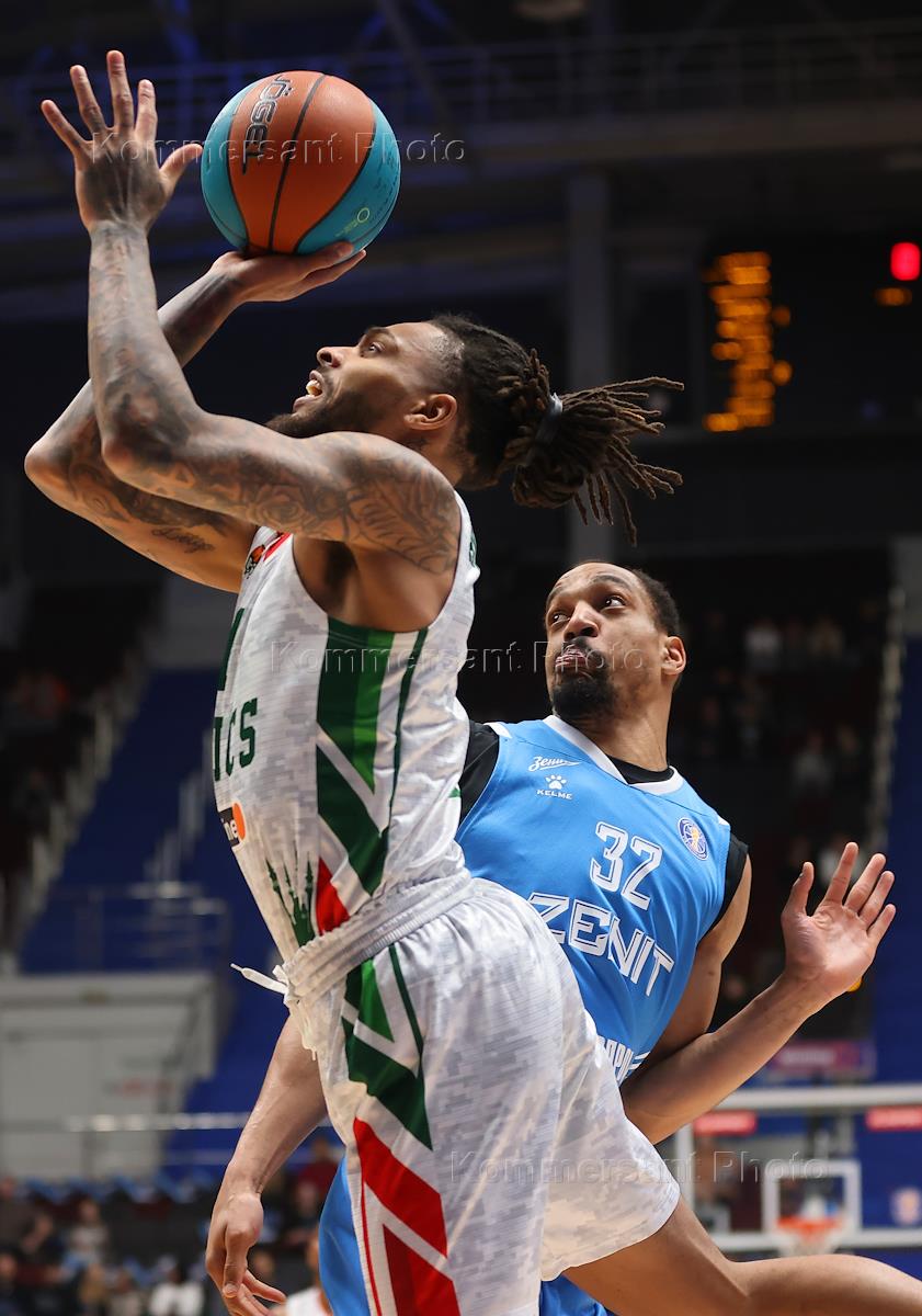 VTB United Basketball League. Match between the teams "Zenit" (St. Petersburg) - UNICS (Kazan) at the Arena stadium. UNICS team player Devon Akun-Purcell (left) and Zenit team player Dwayne Bacon (right) during the match.