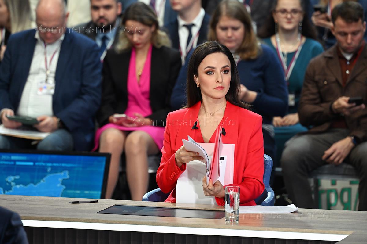 Пресс-конференция и прямая линия "Итоги года 2024" с президентом России Владимиром Путиным в совмещенном формате в Гостином дворе. Телеведущая Александра Суворова перед началом пресс-конференции.