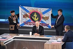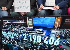 Пресс-конференция и прямая линия "Итоги года 2024" с президентом России Владимиром Путиным в совмещенном формате в Гостином дворе. Табличка "Чечня магистраль".