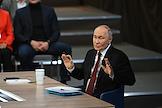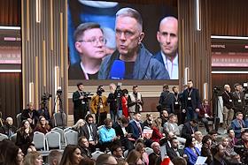 Пресс-конференция и прямая линия "Итоги года 2024" с президентом России Владимиром Путиным в совмещенном формате в Гостином дворе. Специальный корреспондент ИД "КоммерсантЪ" Андрей Колесников (на экране) задает вопрос во время пресс-конференции.