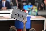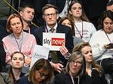 Пресс-конференция и прямая линия "Итоги года 2024" с президентом России Владимиром Путиным в совмещенном формате в Гостином дворе. Участник держит табличку "Скай Ньюс" (Sky News).