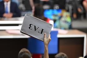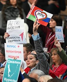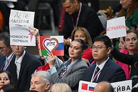 Пресс-конференция и прямая линия "Итоги года 2024" с президентом России Владимиром Путиным в совмещенном формате в Гостином дворе. Участники держат табличку "Дети движение первых".