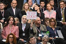 Пресс-конференция и прямая линия "Итоги года 2024" с президентом России Владимиром Путиным в совмещенном формате в Гостином дворе. Участница держит табличку "Чечня важно".