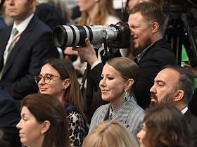 Пресс-конференция и прямая линия "Итоги года 2024" с президентом России Владимиром Путиным в совмещенном формате в Гостином дворе. Телеведущая Ксения Собчак (в центре) во время пресс-конференции.