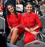 Пресс-конференция и прямая линия "Итоги года 2024" с президентом России Владимиром Путиным в совмещенном формате в Гостином дворе. Участники пресс-конференции в национальных костюмах перед началом.
