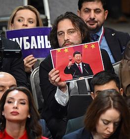 Пресс-конференция и прямая линия "Итоги года 2024" с президентом России Владимиром Путиным в совмещенном формате в Гостином дворе. Участники держат табличку "Калмыкия".