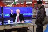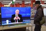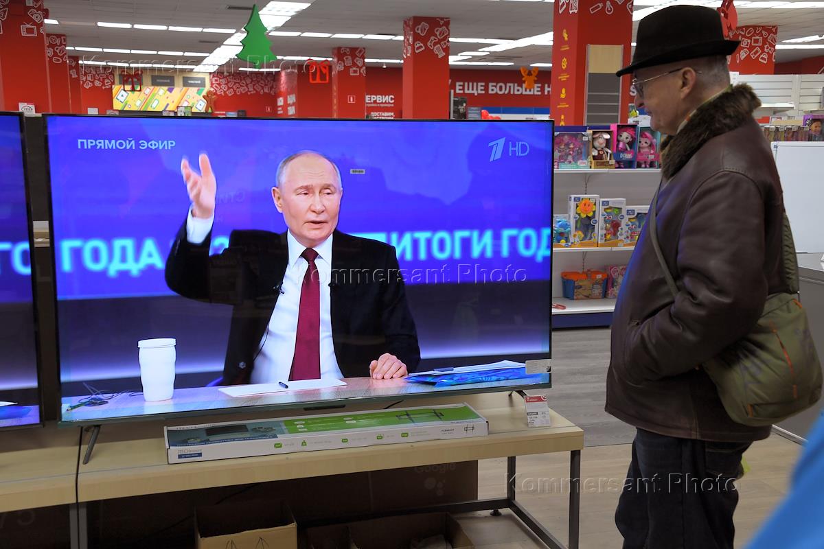 Трансляция пресс-конференции и прямой линии "Итоги года 2024" с президентом России Владимиром Путиным в совмещенном формате в Гостином дворе. Жанровая фотография. Мужчина смотрит трансляцию по экрану телевизора в торговом зале магазина бытовой техники.