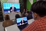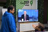 Трансляция пресс-конференции и прямой линии "Итоги года 2024" с президентом России Владимиром Путиным в совмещенном формате в Гостином дворе. Жанровая фотография. Люди смотрят трансляцию по экрану телевизора в центре "Мой бизнес Крым".