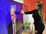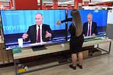 Трансляция пресс-конференции и прямой линии "Итоги года 2024" с президентом России Владимиром Путиным в совмещенном формате в Гостином дворе. Жанровая фотография. Девушка вытирает пыль с экрана телевизора во время трансляции в торговом зале магазина бытовой техники.