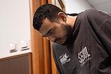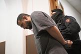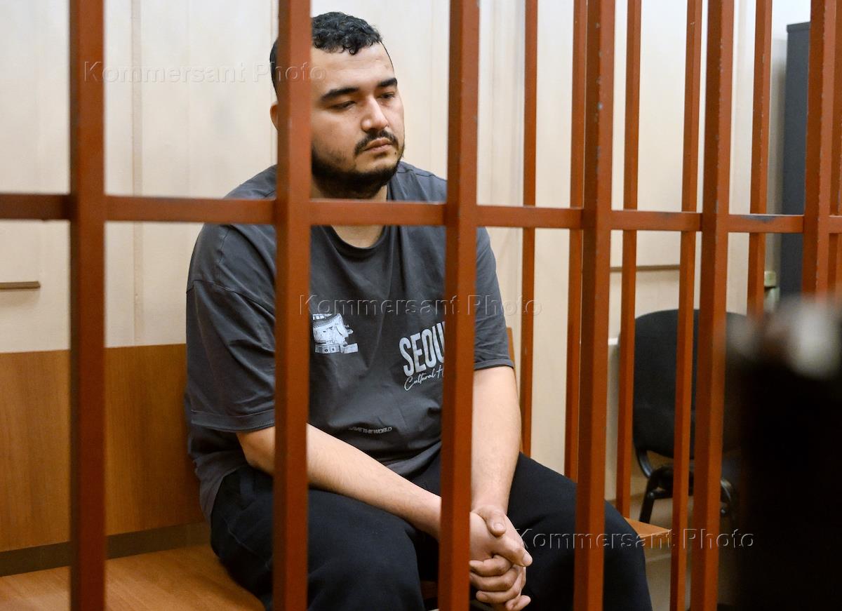 Заседание Басманного районного суда по избранию меры пресечения подозреваемому по делу о теракте гражданину Узбекистана Ахмаджону Алижону угли Курбонову, в результате которого были убиты начальник войск радиационной, химической и биологической защиты Вооруженных сил России генерал Игорь Кириллов и его помощник Илья Поликарпов. Подозреваемый по делу о теракте гражданин Узбекистана Ахмаджон Алижон угли Курбонов перед заседанием суда.