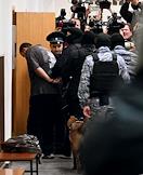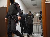 Заседание Басманного районного суда по избранию меры пресечения подозреваемому по делу о теракте гражданину Узбекистана Ахмаджону Алижону угли Курбонову, в результате которого были убиты начальник войск радиационной, химической и биологической защиты Вооруженных сил России генерал Игорь Кириллов и его помощник Илья Поликарпов. Подозреваемый по делу о теракте гражданин Узбекистана Ахмаджон Алижон угли Курбонов (в центре) перед заседанием суда.