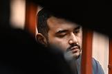 Заседание Басманного районного суда по избранию меры пресечения подозреваемому по делу о теракте гражданину Узбекистана Ахмаджону Алижону угли Курбонову, в результате которого были убиты начальник войск радиационной, химической и биологической защиты Вооруженных сил России генерал Игорь Кириллов и его помощник Илья Поликарпов. Подозреваемый по делу о теракте гражданин Узбекистана Ахмаджон Алижон угли Курбонов во время заседания суда.