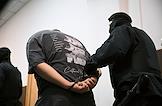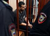 Заседание Басманного районного суда по избранию меры пресечения подозреваемому по делу о теракте гражданину Узбекистана Ахмаджону Алижону угли Курбонову, в результате которого были убиты начальник войск радиационной, химической и биологической защиты Вооруженных сил России генерал Игорь Кириллов и его помощник Илья Поликарпов. Подозреваемый по делу о теракте гражданин Узбекистана Ахмаджон Алижон угли Курбонов (слева) перед заседанием суда.
