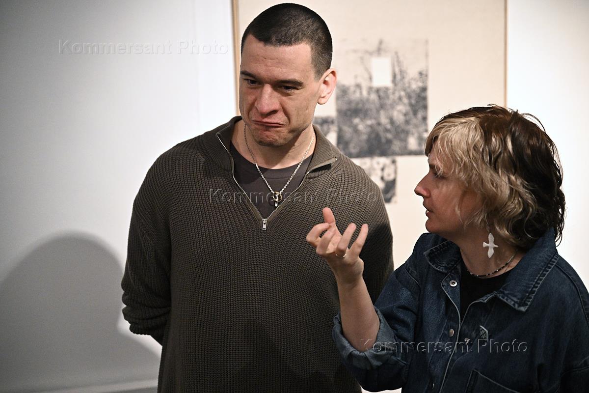 Церемония открытия выставки художницы Тамары Шипициной "Палисадники" в рамках Программы поддержки молодого искусства в Московском музее современного искусства (MMOMA) на Гоголевском бульваре. Предприниматель Ян Яновский (слева) и владелица галереи современной живописи Carre d'artistes Юлия Акимова (справа) на церемонии.