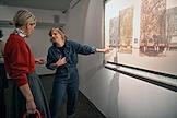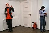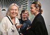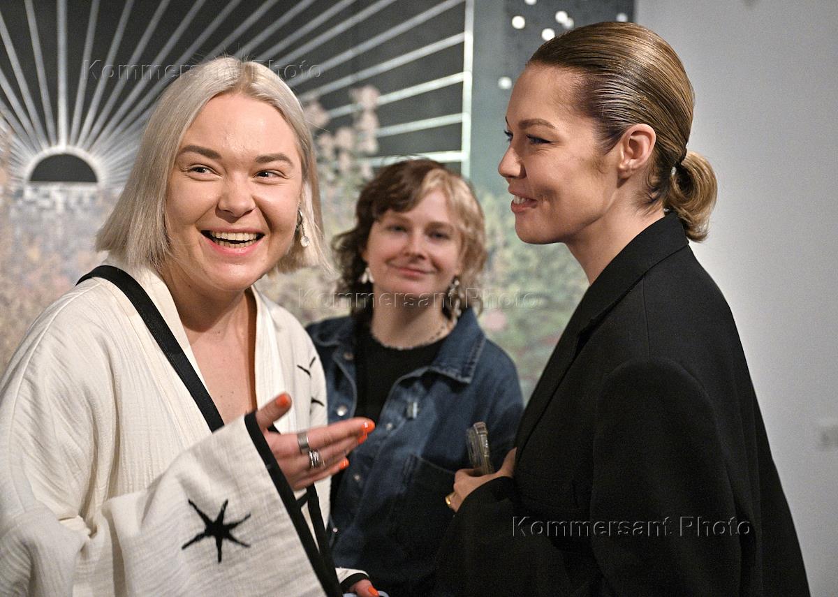Церемония открытия выставки художницы Тамары Шипициной "Палисадники" в рамках Программы поддержки молодого искусства в Московском музее современного искусства (MMOMA) на Гоголевском бульваре. Слева направо: куратор Елена Антипова, художница Тамара Шипицина и владелица галереи современной живописи Carre d'artistes Юлия Акимова на церемонии.