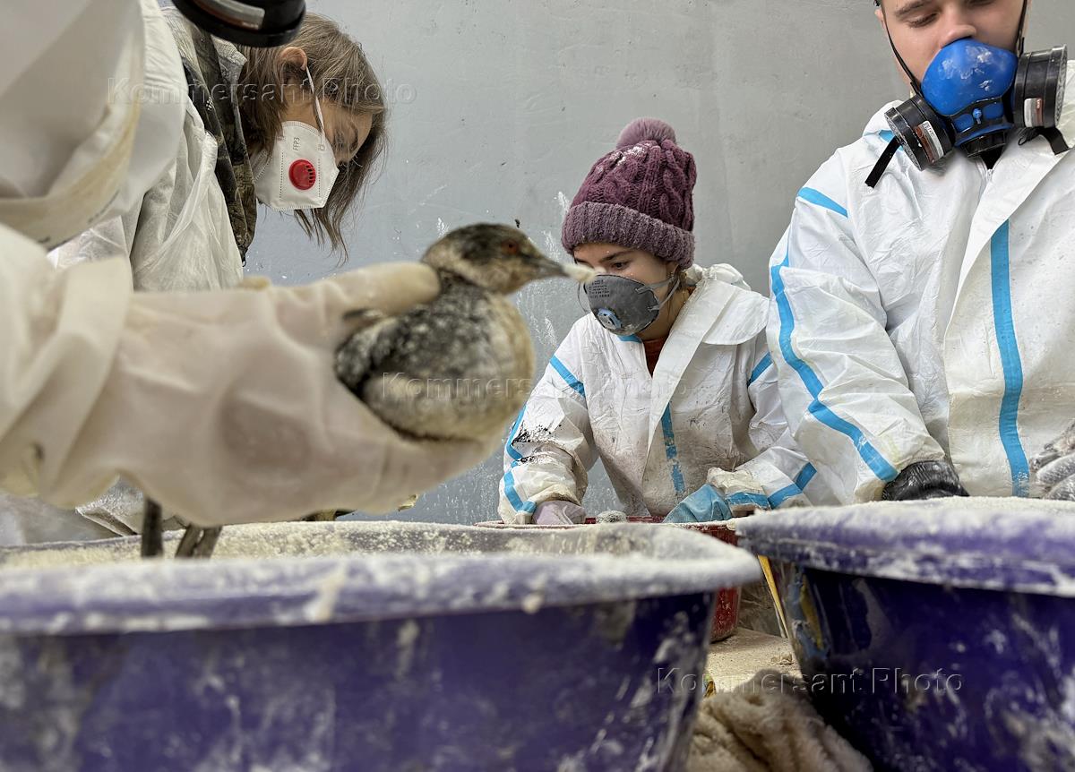 Ликвидация последствий разлива нефтепродуктов из-за потерпевших бедствие двух танкеров "Волгонефть" в Керченском проливе днем 15 декабря 2024 года, на береговой линии в Анапе. Волонтеры отмывают от мазута птиц, запачканных в результате разлива нефтепродуктов на береговой линии.