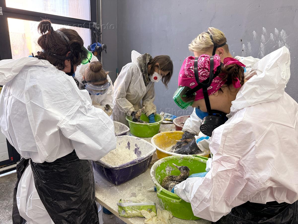 Ликвидация последствий разлива нефтепродуктов из-за потерпевших бедствие двух танкеров "Волгонефть" в Керченском проливе днем 15 декабря 2024 года, на береговой линии в Анапе. Волонтеры отмывают от мазута птиц, запачканных в результате разлива нефтепродуктов на береговой линии.
