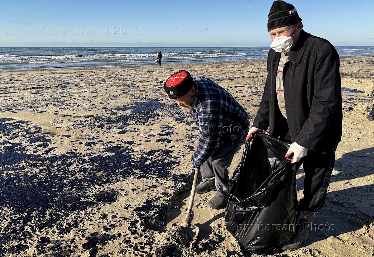 Elimination of the consequences of an oil spill due to the disaster of two Volgoneft tankers in the Kerch Strait on the afternoon of December 15, 2024 on the coastline in Anapa. Genre photography.