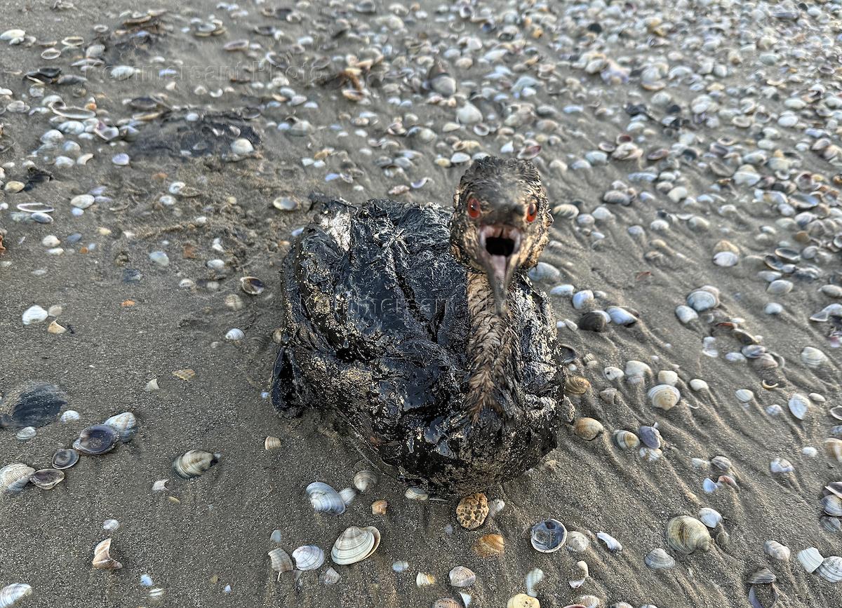 Ликвидация последствий разлива нефтепродуктов из-за потерпевших бедствие двух танкеров "Волгонефть" в Керченском проливе днем 15 декабря 2024 года на береговой линии в Анапе. Баклан, запачканный мазутом в результате разлива нефтепродуктов на береговой линии.