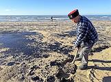 Ликвидация последствий разлива нефтепродуктов из-за потерпевших бедствие двух танкеров "Волгонефть" в Керченском проливе днем 15 декабря 2024 года на береговой линии в Анапе. Пятна мазута на песке пляжа.