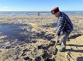 Ликвидация последствий разлива нефтепродуктов из-за потерпевших бедствие двух танкеров "Волгонефть" в Керченском проливе днем 15 декабря 2024 года на береговой линии в Анапе. Жанровая фотография.
