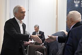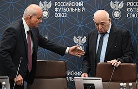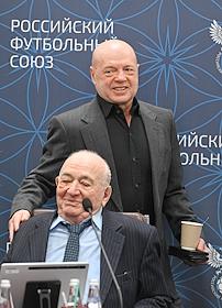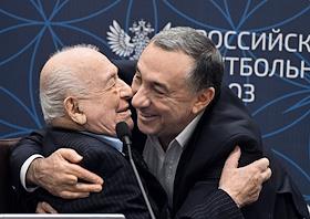 Заседание исполнительного комитета Российского Футбольного Союза (РФС) в Доме футбола. Президент Союза ветеранов футбола России Александр Мирзоян (слева) и первый вице-президент РФС Никита Симонян (справа) перед началом заседания.