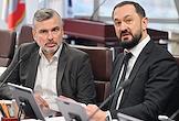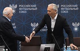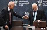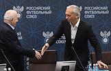 Заседание исполнительного комитета Российского Футбольного Союза (РФС) в Доме футбола. Генеральный директор Общероссийского профессионального союза футболистов Александр Зотов (слева) и президент Ассоциации профессиональных футбольных клубов "Футбольная национальная лига" Наиль Измайлов (справа) перед началом заседания.