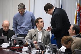Заседание исполнительного комитета Российского Футбольного Союза (РФС) в Доме футбола. Вице-президент РФС, советник президента РФС Игорь Каменский (слева), вице-президент РФС, президент Российской премьер лиги (РПЛ) Александр Алаев (в центре), генеральный секретарь РФС Максим Митрофанов (третий справа), президент ФК "Сочи" Борис Ротенберг (второй справа) и вице-президент РФС, президент ПФК ЦСКА (Москва) Евгений Гинер (справа) перед началом заседания.