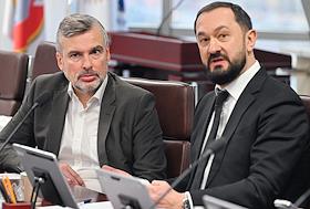 Заседание исполнительного комитета Российского Футбольного Союза (РФС) в Доме футбола. Первый вице-президент РФС Никита Симонян (слева) и вице-президент РФС, президент ПФК ЦСКА (Москва) Евгений Гинер (справа) перед началом заседания.