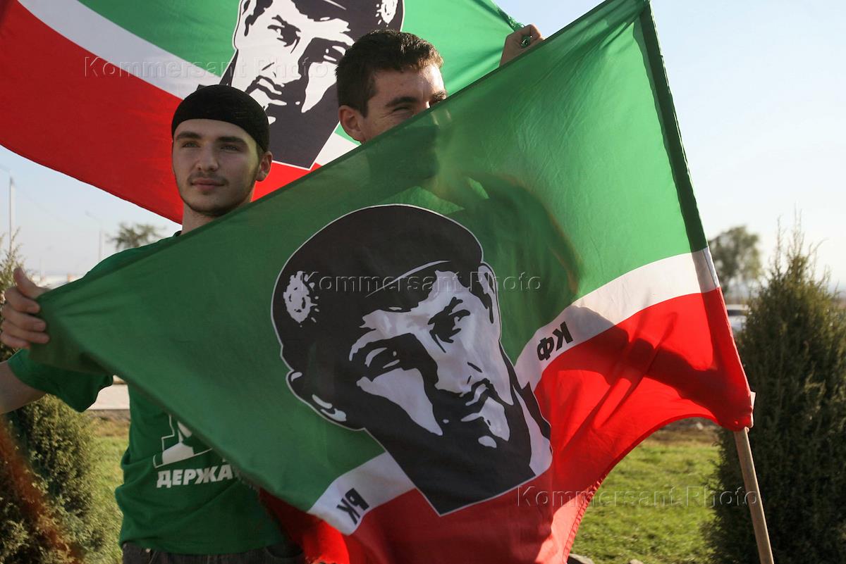 Молодые люди в футболках с портретом Рамзана Кадырова и надписью "Так держать!" на церемонии открытия аэропорта в Грозном. Открытие аэропорта приурочено к дню рождения Рамзана Кадырова.
