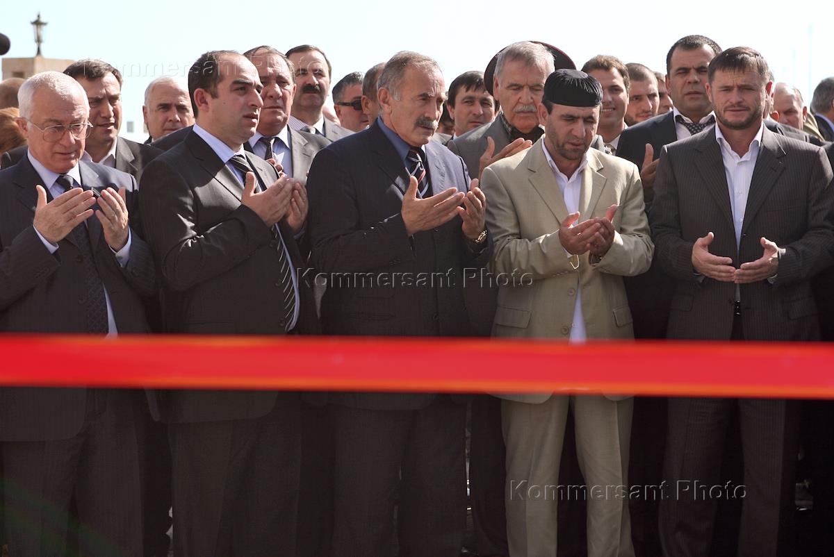 Советник Президента России Асламбек Аслаханов (в центре), муфтий Чечни Султан - Хаджи Мирзаев (второй справа), брат Ахмата Кадырова Магомед Кадыров (справа) на церемонии открытия аэропорта в Грозном. Открытие аэропорта приурочено к дню рождения Рамзана Кадырова.