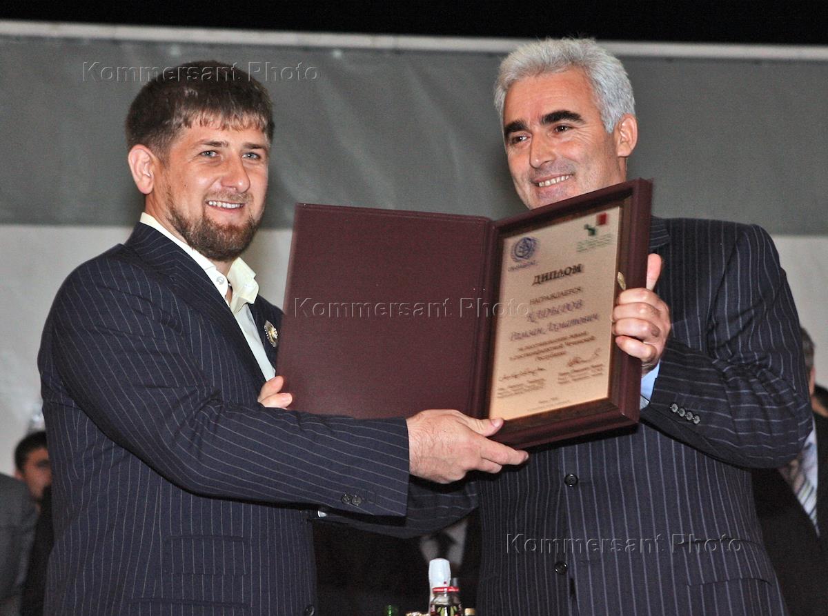 Мэр Грозного Мовсар Темирбаев (справа) во время празднования Дня рождения председателя правительства Чеченской республики Рамзана Кадырова (слева).