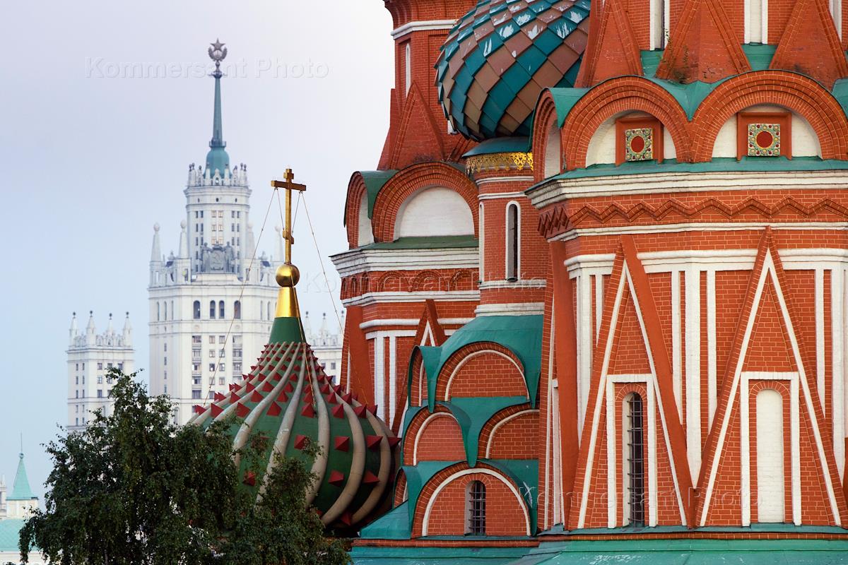 Виды Москвы. Собор Покрова Пресвятой Богородицы, что на Рву (храм Василия Блаженного) и высотное жилое здание на Котельнической набережной.