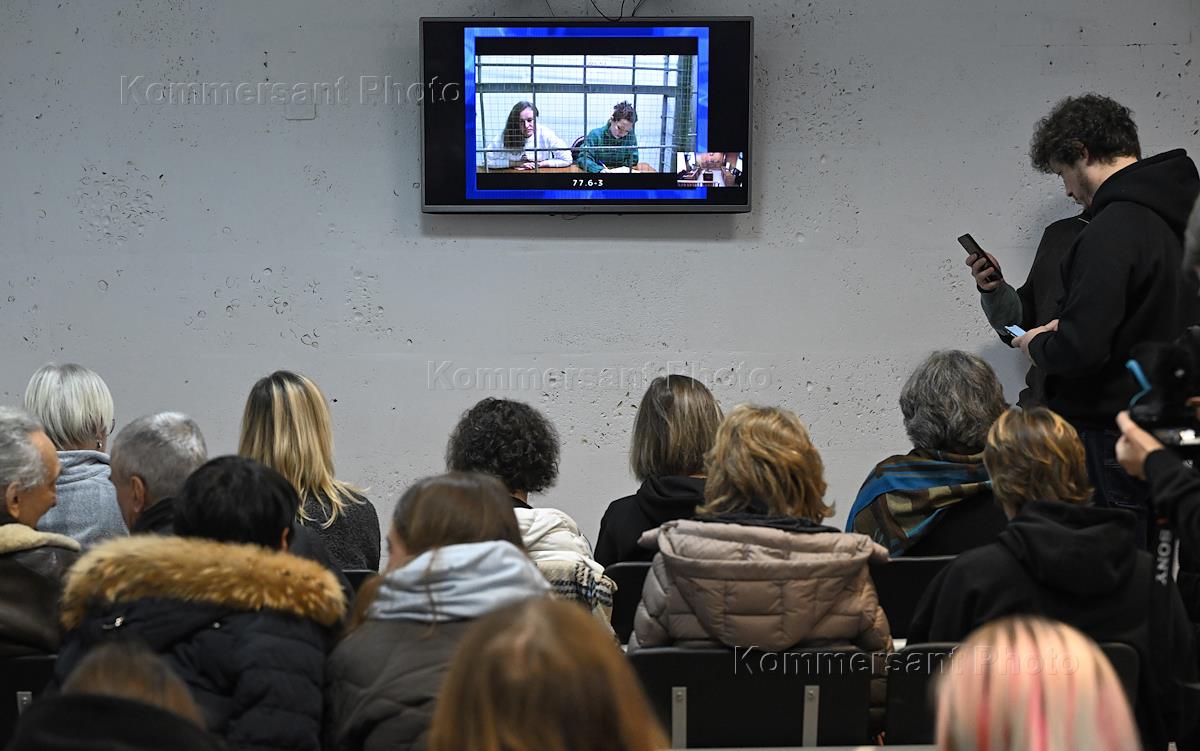 Оглашение решения по жалобам на приговор режиссеру Евгении Беркович и драматургу Светлане Петрийчук по делу об оправдании терроризма при постановке пьесы "Финист ясный сокол" в Апелляционном военном суде. Журналист Дмитрий Муратов (признан иноагентом) (в центре) в здании суда.